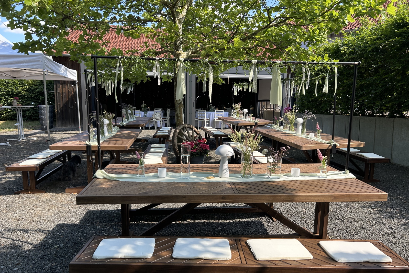 Unter den Platanen - gesellig genießen im Freien lädt dieser Platz unter dem dichten Blätterdach Platanen zum Verweilen ein. Hier finden Gäste an liebevoll gedeckten Tischen reichlich Sitzgelegenheiten, während Stehplätze rund um die Bar für lockere Gespräche sorgen. Im natürlichen Schatten, begleitet vom leisen Rascheln der Blätter, entsteht ein Ort, an dem sich Sommerabende endlos anfühlen und jede Feier ihren ganz besonderen Charme entfaltet.